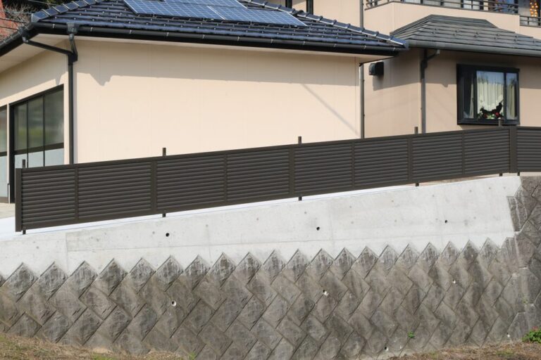 新しく設置するブロックは、庭の土留めに必要な高さまでとし、ブロックの上に高さ1.2mのアルミフェンスを目隠しとして設置しました。車椅子用のスロープは、ご希望の玄関前だと距離が短く傾斜が急になり危険なので、スロープ用の通路を新たに設置しました。